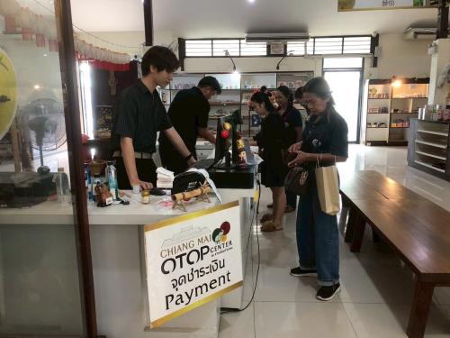 นางณิชพลัฏฐ์ วรรณคำ พัฒนาการจังหวัดเชียงใหม่ มอบหมายให้ นางสาวรุ่งอรุณ หงษ์ทอง นักส่งเสริมการพัฒนาชุมชน เป็นวิทยากรบรรยายในหัวข้อ การบริหารจัดการศูนย์แสดง จำหน่าย และกระจายสินค้า OTOP จังหวัดเชียงใหม่ และต้อนรับคณะศึกษาดูงานจากตำบลหนองหญ้าดอกขาว อำเภอท่าม่วง จังหวัดกาญจนบุรี จำนวน 44 คน พร้อมทั้งแลกเปลี่ยนเรียนรู้การบริหารจัดการศูนย์จำหน่ายสินค้า OTOP ระหว่างศูนย์ฯ OTOP และคณะศึกษาดูงาน โดยมีนายชาญชัย ปัญโญสุข ประธานวิสาหกิจชุมชนกลุ่มหัตถกรรมตีลายแผ่นแร่และไม้บ้านป่าสักขวาง อำเภอสันกำแพง และเจ้าหน้าที่ศูนย์แสดงจำหน่าย และกระจายสินค้า OTOP จังหวัดเชียงใหม่ (ข่วงสันกำแพง) ร่วมต้อนรับ จากนั้นคณะศึกษาดูงาน ได้เข้าเยี่ยมชมและอุดหนุนสินค้า OTOP จังหวัดเชียงใหม่