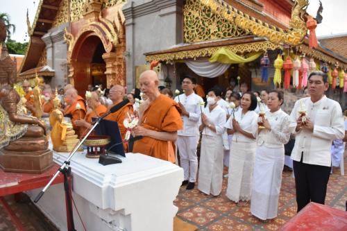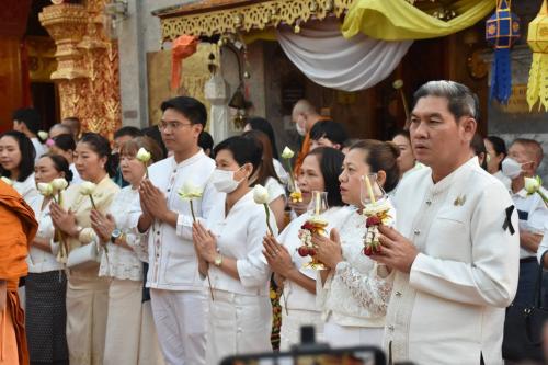 ณ วัดพระธาตุดอยสุเทพราชวรวิหาร ตำบลสุเทพ อำเภอเมืองเชียงใหม่ จังหวัดเชียงใหม่ นายรัฐพล นราดิศร ผู้ว่าราชการจังหวัดเชียงใหม่ พร้อมด้วย นางวิยะดา นราดิศร นายกเหล่ากาชาดจังหวัดเชียงใหม่ นำหัวหน้าส่วนราชการ ข้าราชการ เจ้าหน้าที่ และพุทธศาสนิกชน เข้าร่วมฟังพระธรรมเทศนาและเวียนเทียน เนื่องในวันมาฆบูชา ประจำปี 2569 โดยมีพระธรรมเสนาบดี รองเจ้าคณะภาค 7 เจ้าอาวาสวัดพระธาตุดอยสุเทพราชวรวิหาร เป็นประธานฝ่ายสงฆ์ นำคณะสงฆ์ประกอบศาสนพิธี ท่ามกลางพุทธศาสนิกชนที่เข้าร่วมพิธีเป็นจำนวนมาก บรรยากาศเต็มไปด้วยความสงบ สำรวม และศรัทธา เพื่อร่วมกันระลึกถึงคุณพระรัตนตรัย และน้อมนำหลักธรรมคำสอนไปปรับใช้ในการดำเนินชีวิต